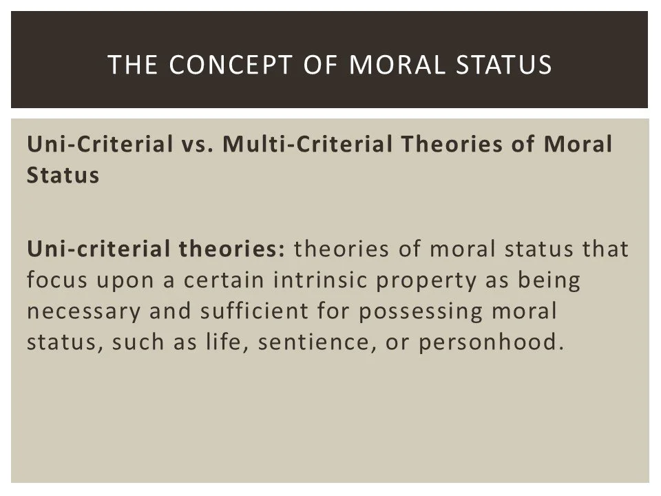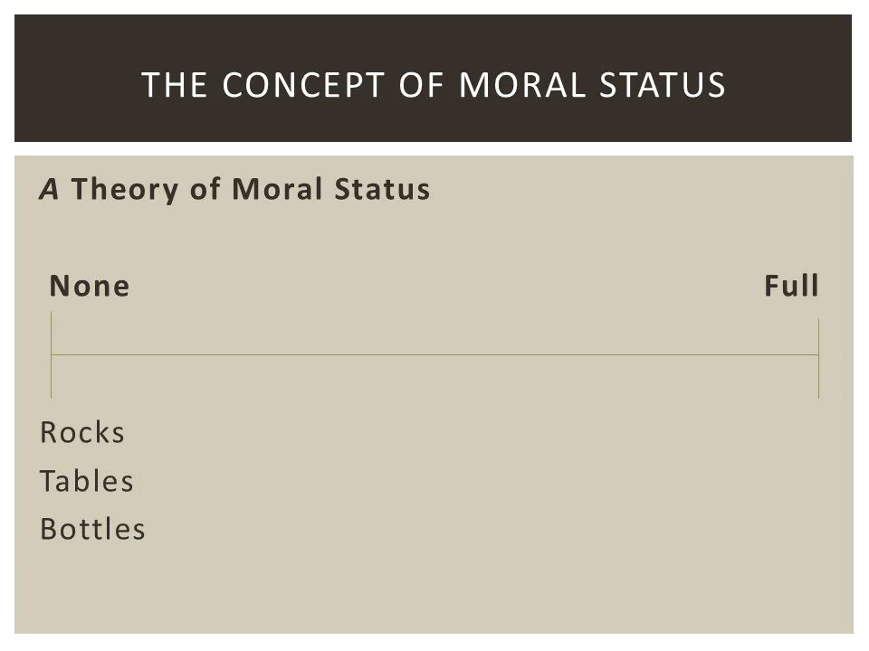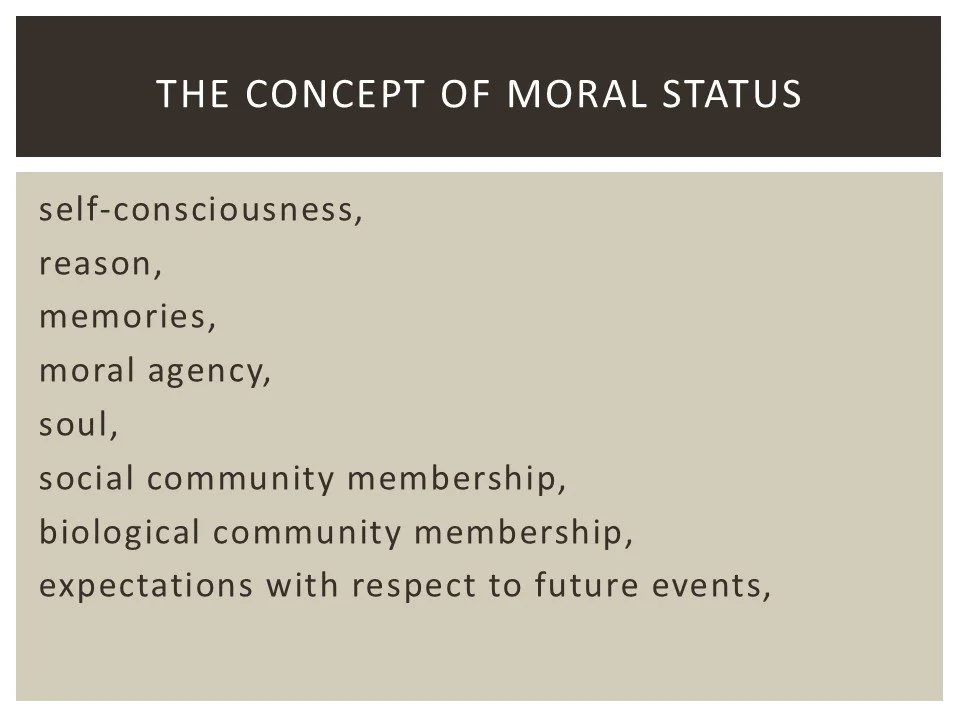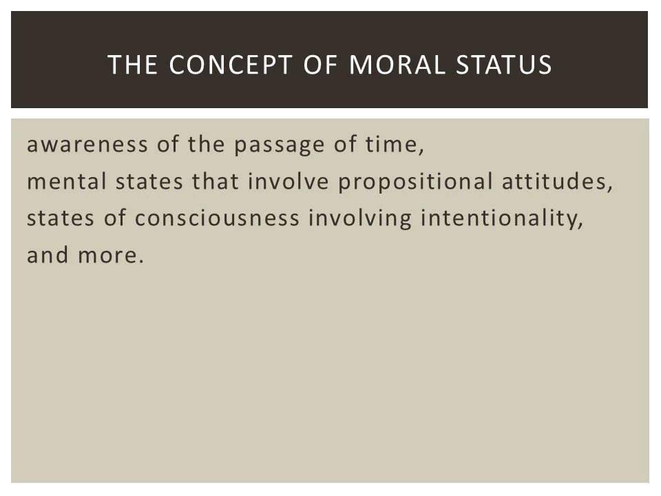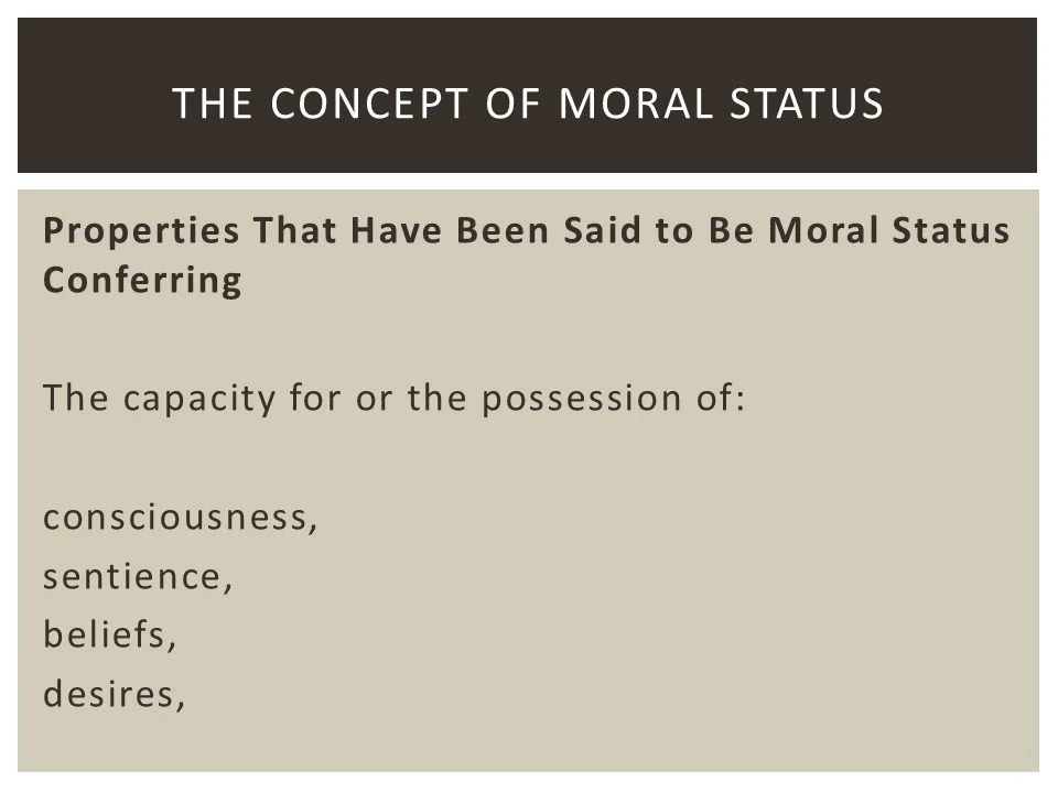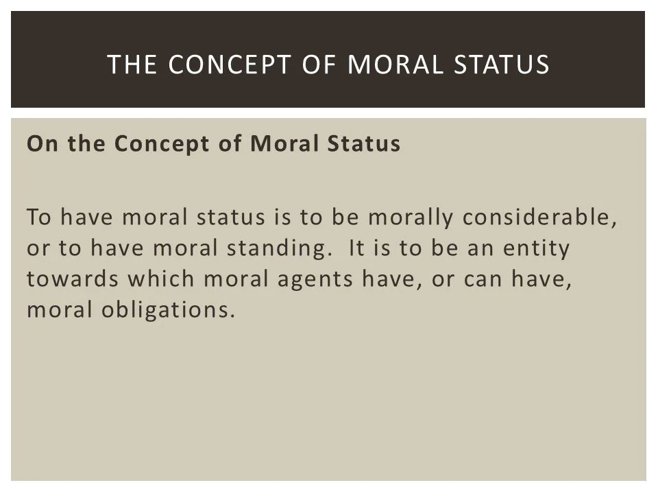 The following are excerpted from the set of PowerPoint slides on the concept of moral status. They are representative of the substance and style of all of the PowerPoint slides that are screen-shared and discussed during the course. Discussions of the course’s PowerPoint slides include presenting arguments for positions on bioethical issues, analyzing the concepts presented therein, explaining the importance of said concepts, and more. Throughout these discussions, Professor Lovering encourages students to participate by sharing their questions, observations, insights, confusions, anecdotes, and anything else (that is topic-relevant) that comes to mind.
